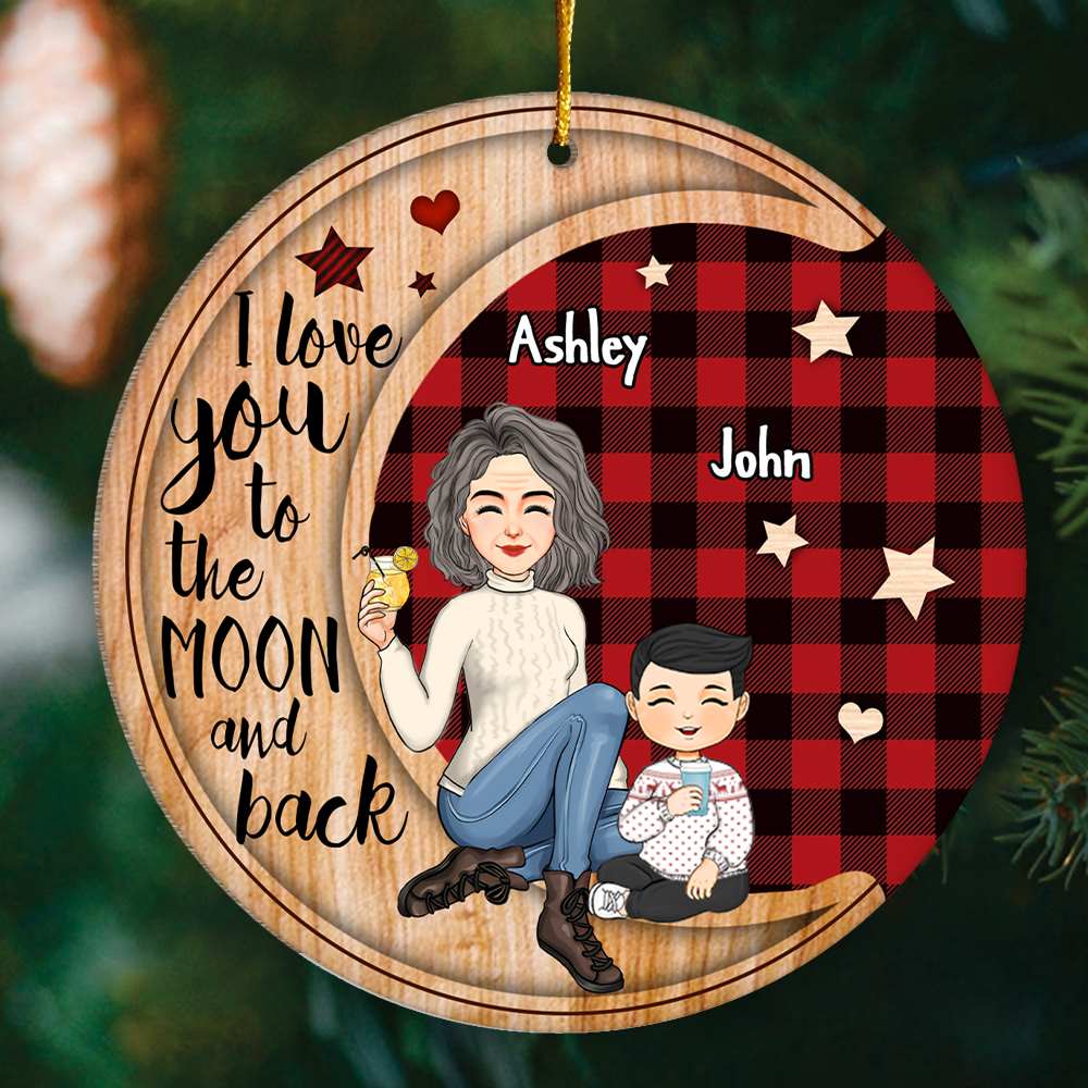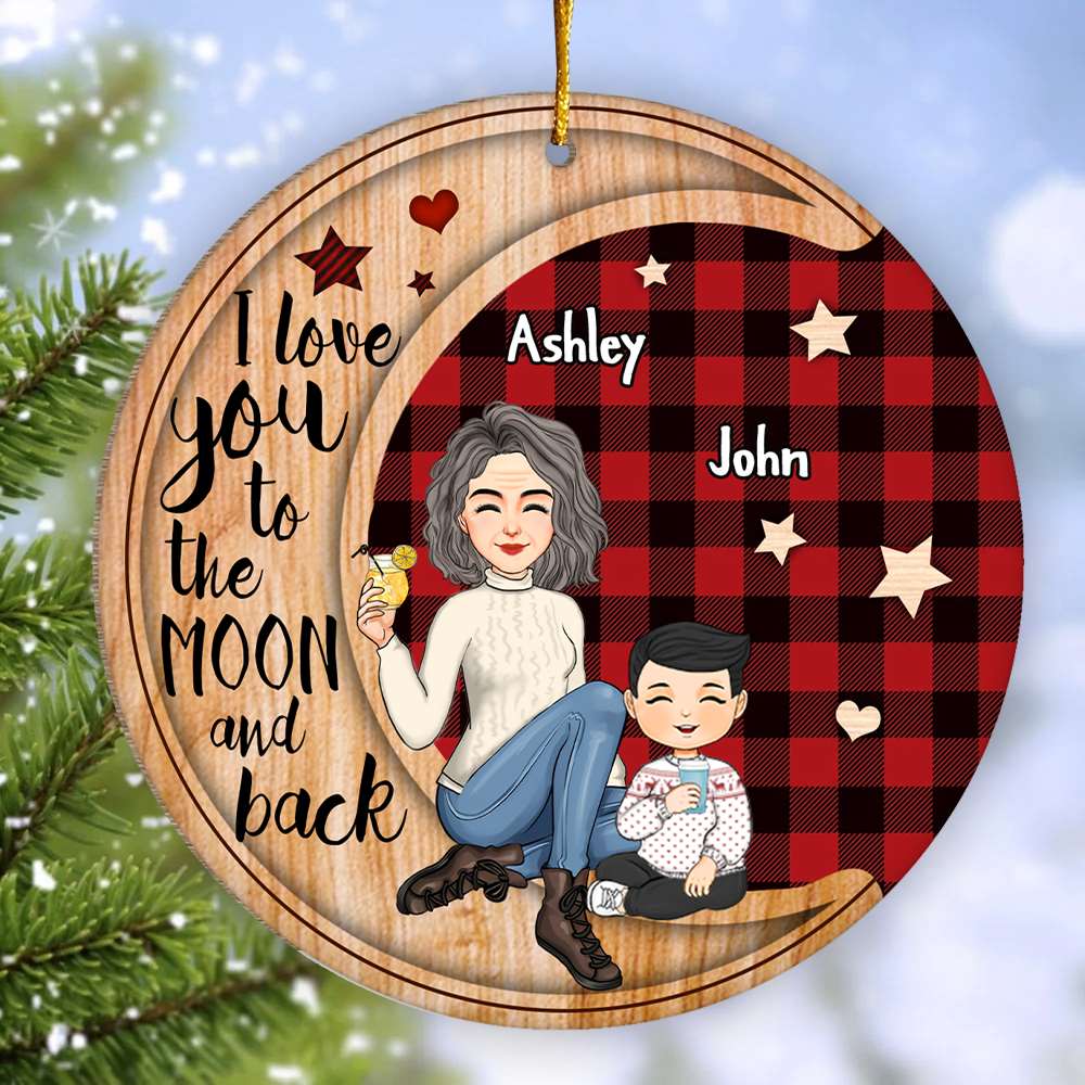 Checkered Pattern Cute Grandma Sitting With Grandkids On Moon Christmas Personalized Wooden Ornament