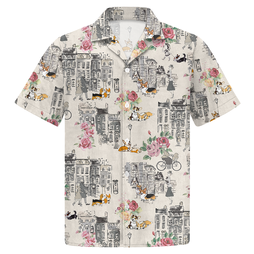 Corgi Walking With Woman In Urban Hawaiian Shirt