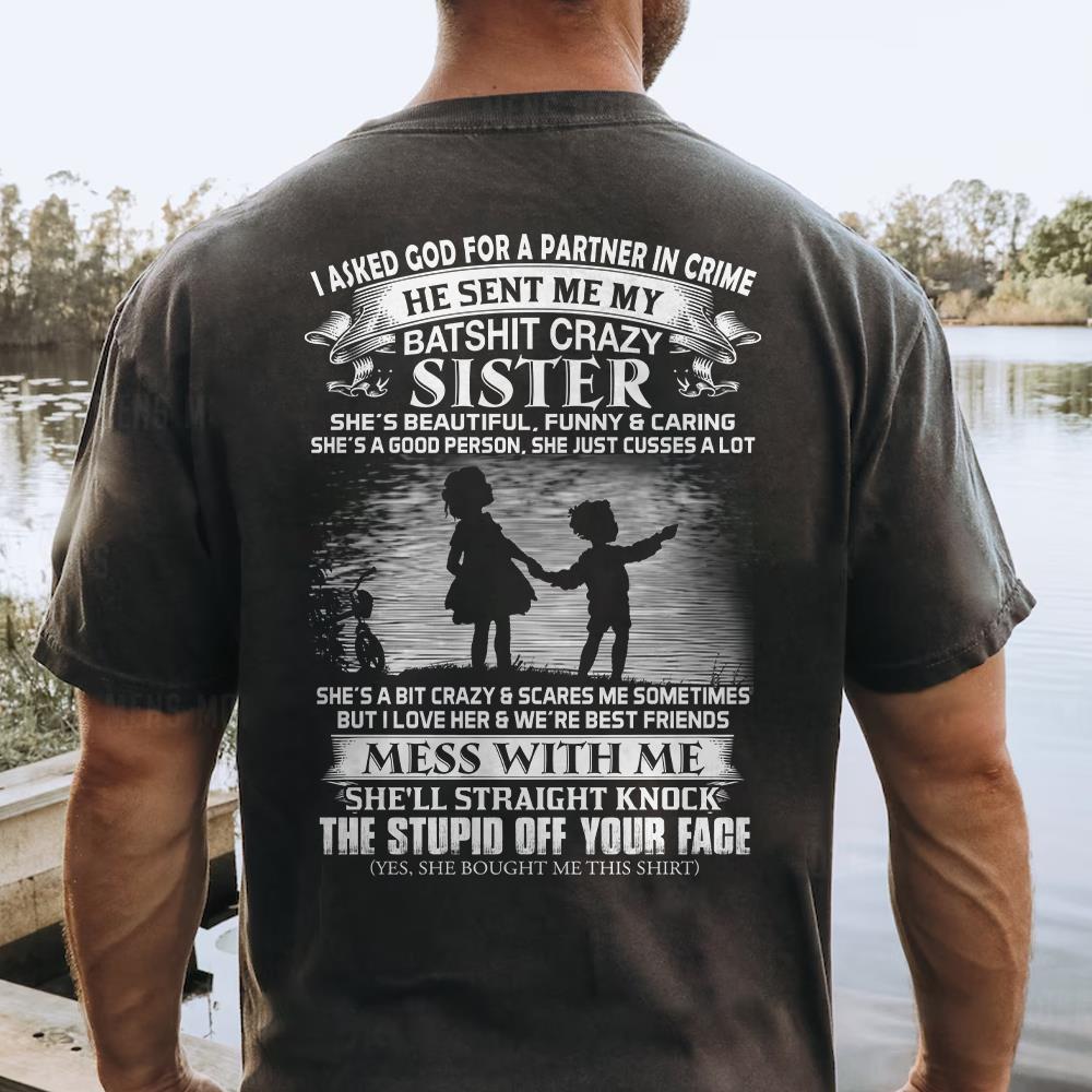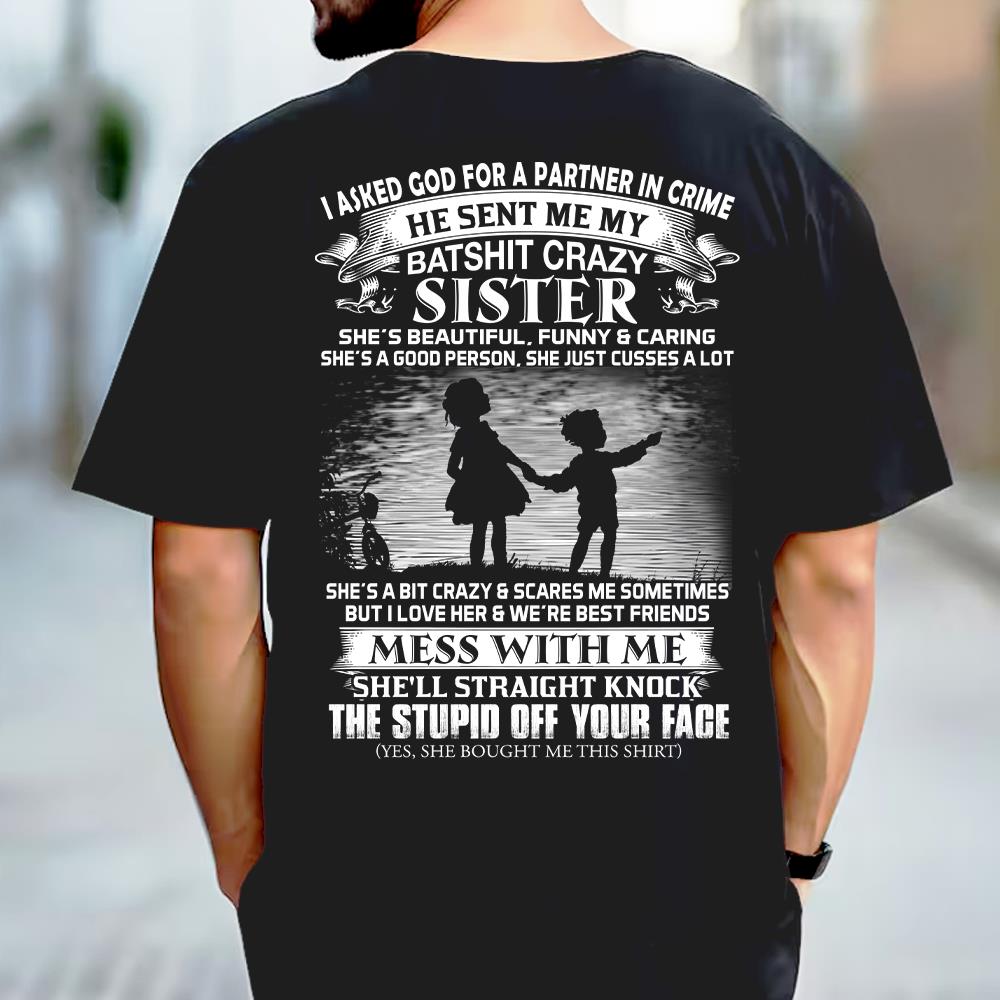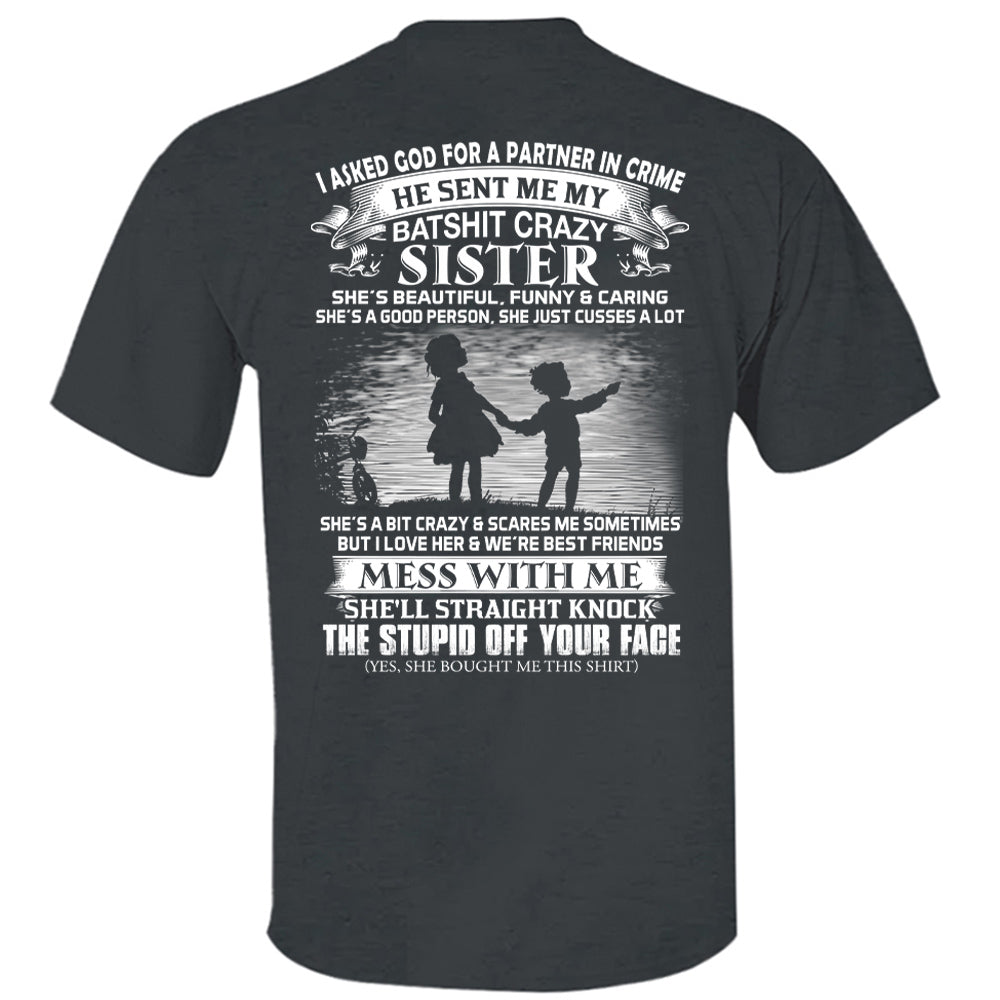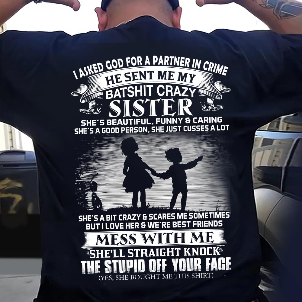 I Asked God For A Partner In Crime He Sent Me My Batshit Crazy Sister Shirt Perfect Gift For Sister & Brother