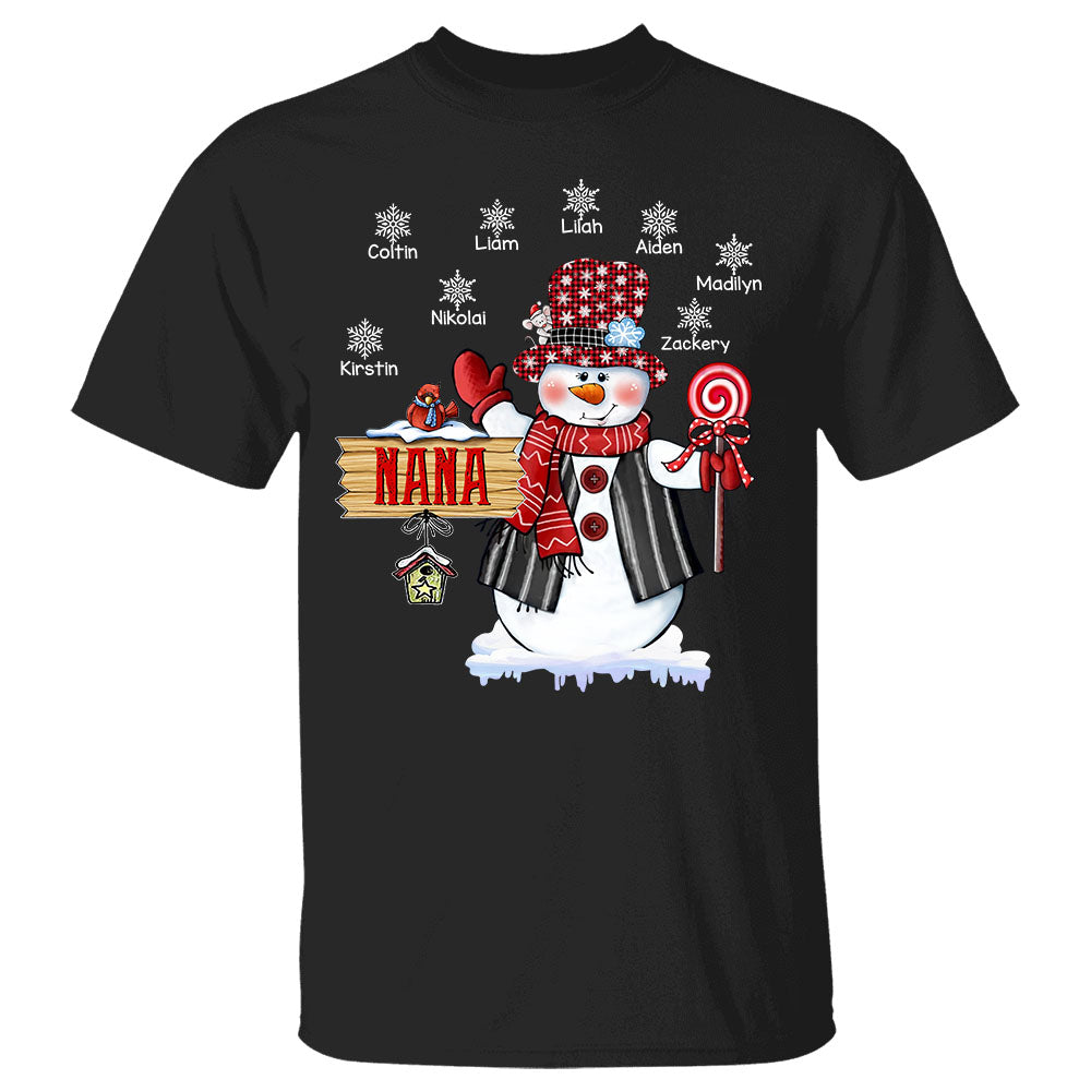 Personalized Nana Snowman With Snowflake Christmas Shirt Funny Nana With Grandkids Name Christmas Shirt