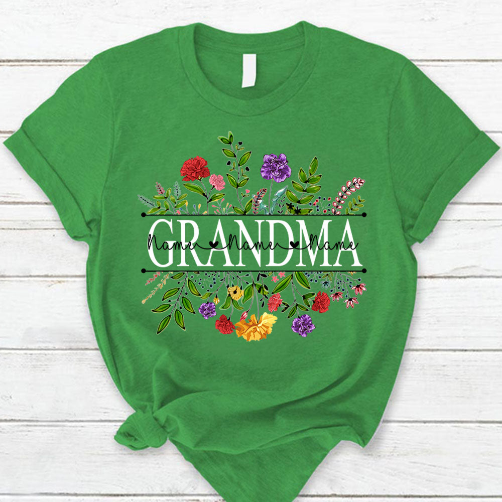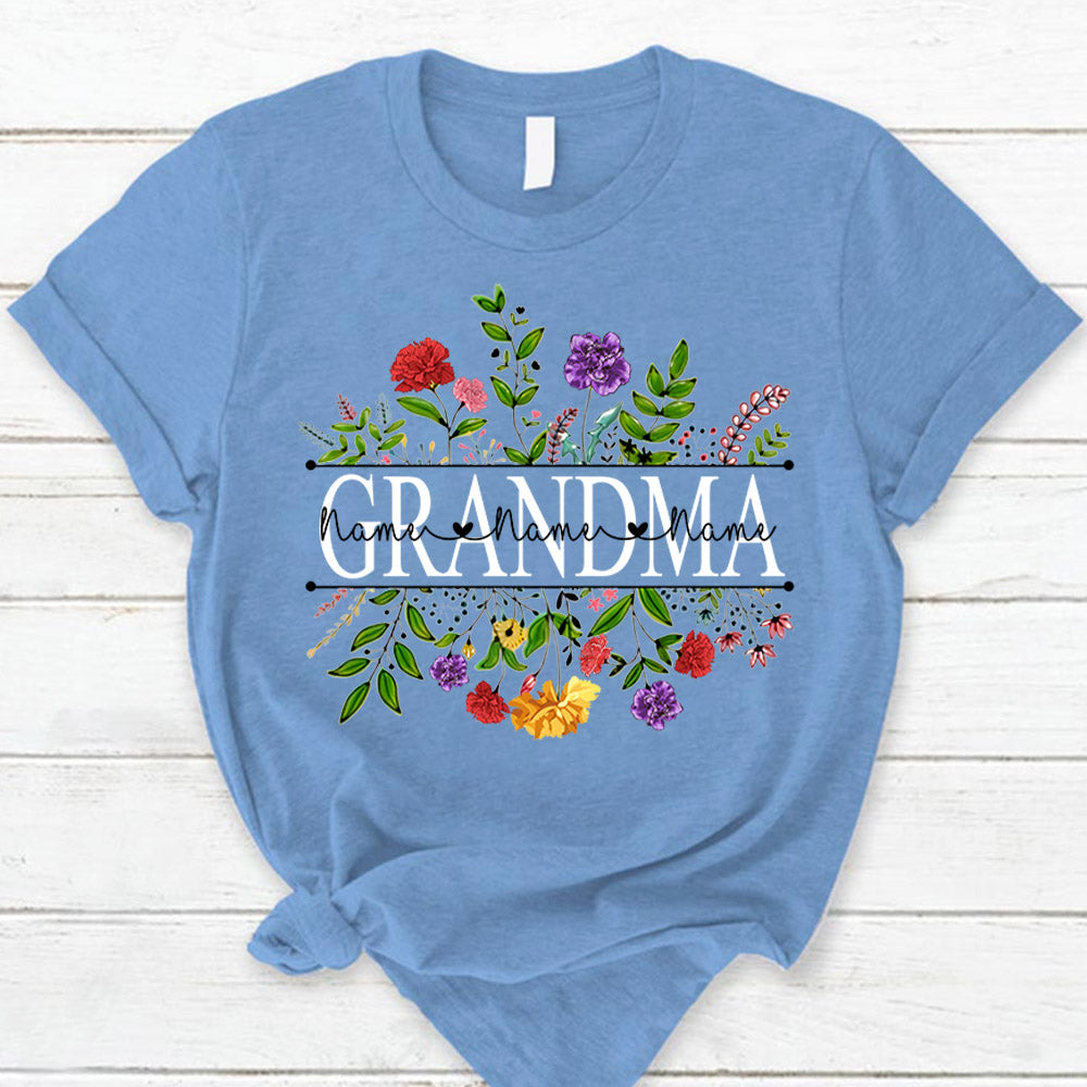 Personalized Grandma With Grandkid's Names Carnation Frame Shirt For Grandma