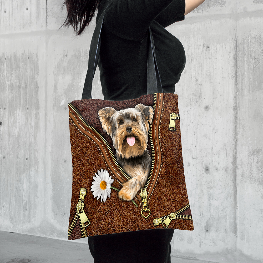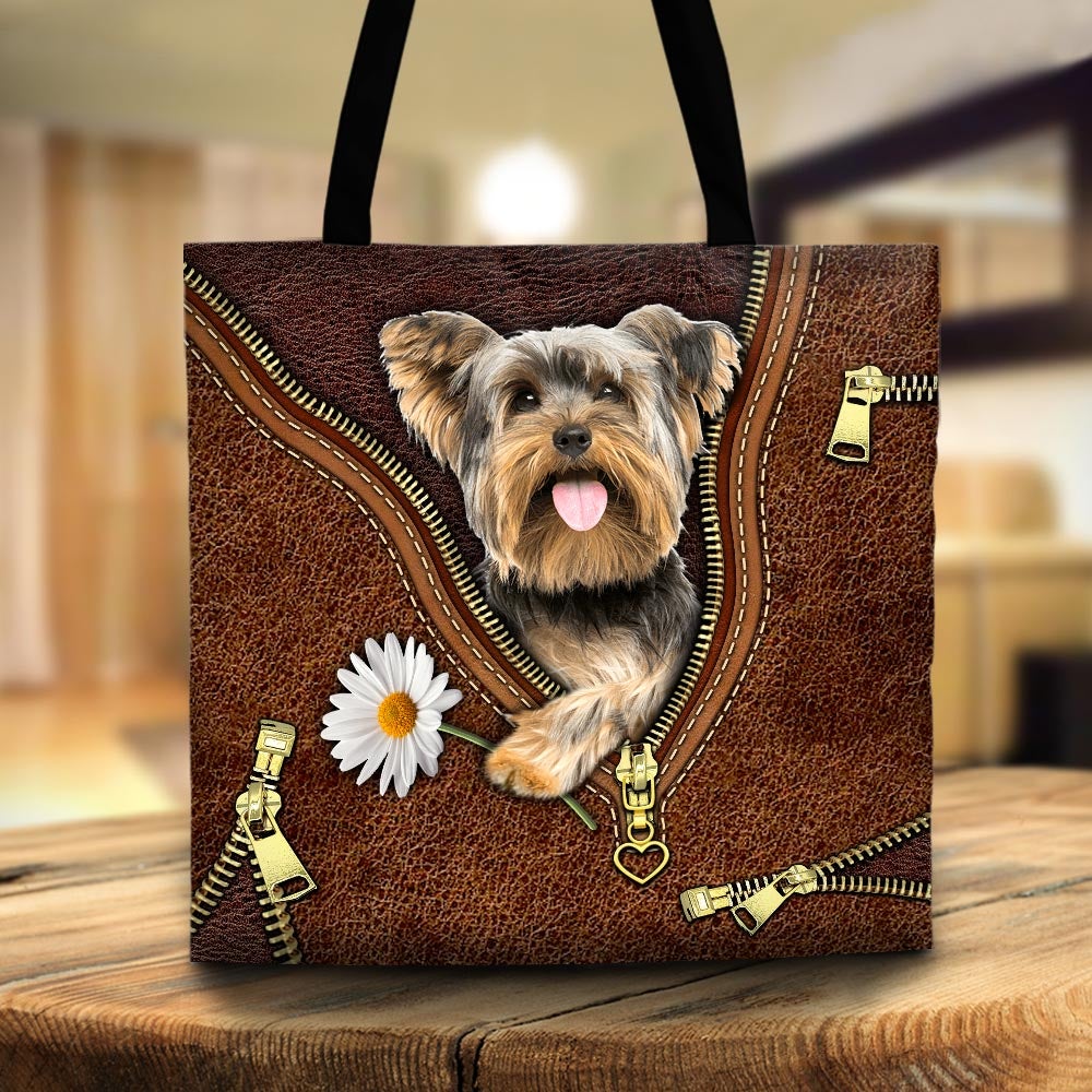 Yorkshire Terrier Holding Daisy Flower Leather Pattern Tote Bag Cute Yorkshire Terrier Daisy Flower Leather Pattern Tote Bag